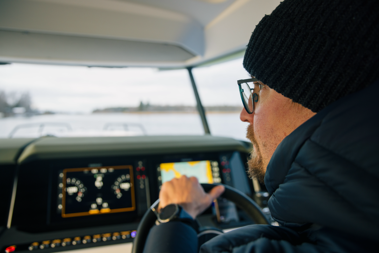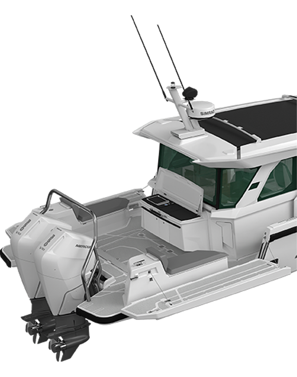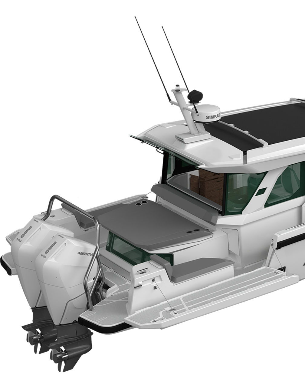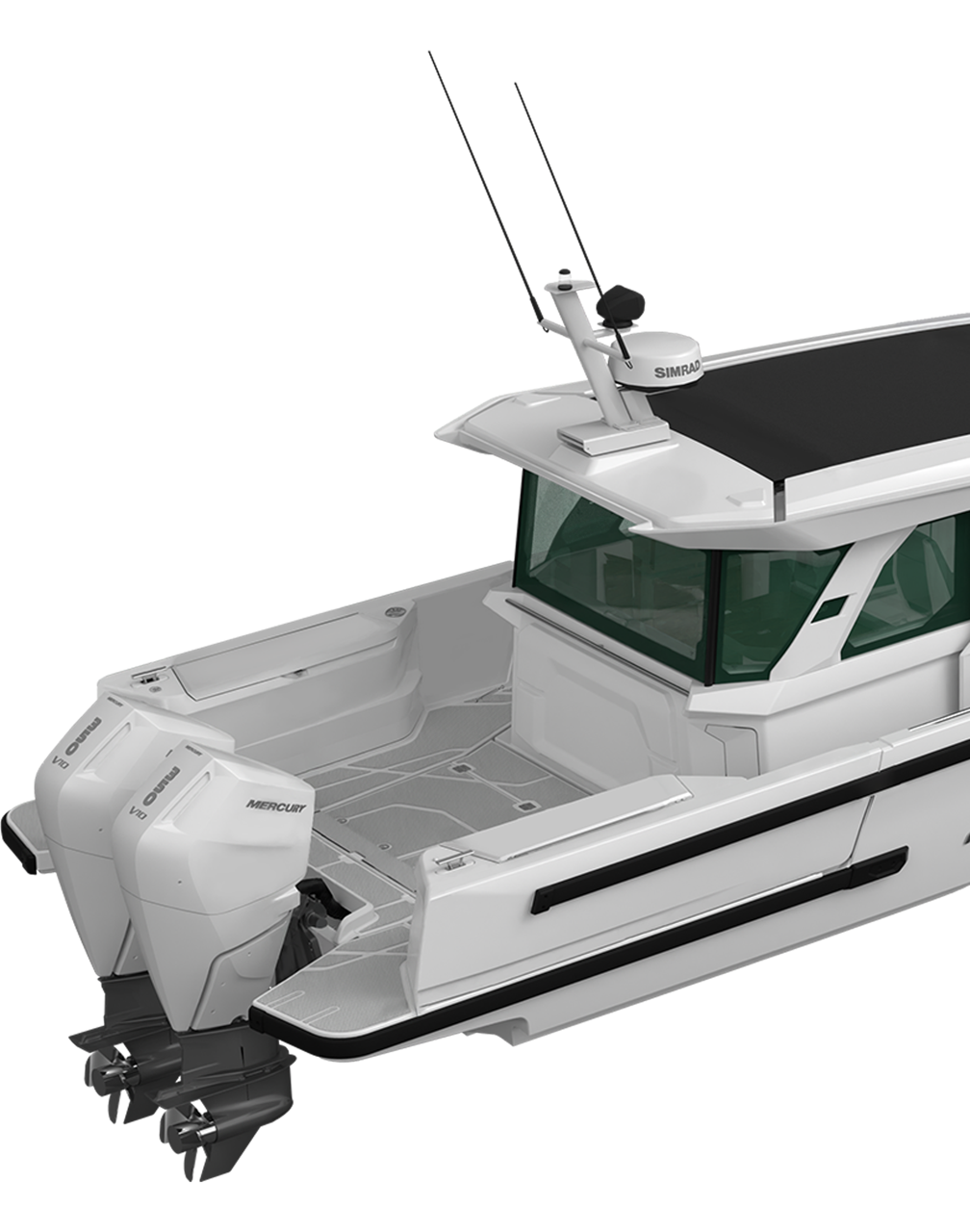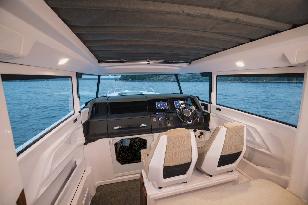 Zaprta krmarska kabina ostaja osrednji del plovila, saj nudi zaščito v zahtevnih razmerah, hkrati pa velika panoramska okna in drsna vrata ohranjajo močno povezanost z morjem. Optimiziran trup z dvojnim korakom zagotavlja hitro, stabilno in predvidljivo plovbo, primerno tako za daljše prehode kot za zahtevnejše vremenske pogoje.